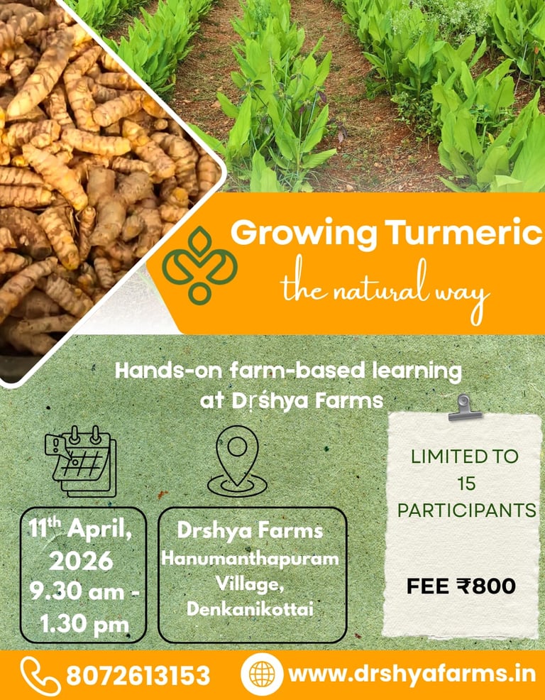 Over four hours at Dṛśhya Farms, you will walk through the full cycle of turmeric cultivation — from selecting planting material to post-harvest handling — with a strong emphasis on what works in real farm settings.